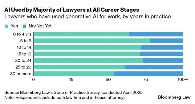 And even among those with 30 or more years in practice—the group with the lowest adoption rate—more than half (54%) said they have used AI in their work.