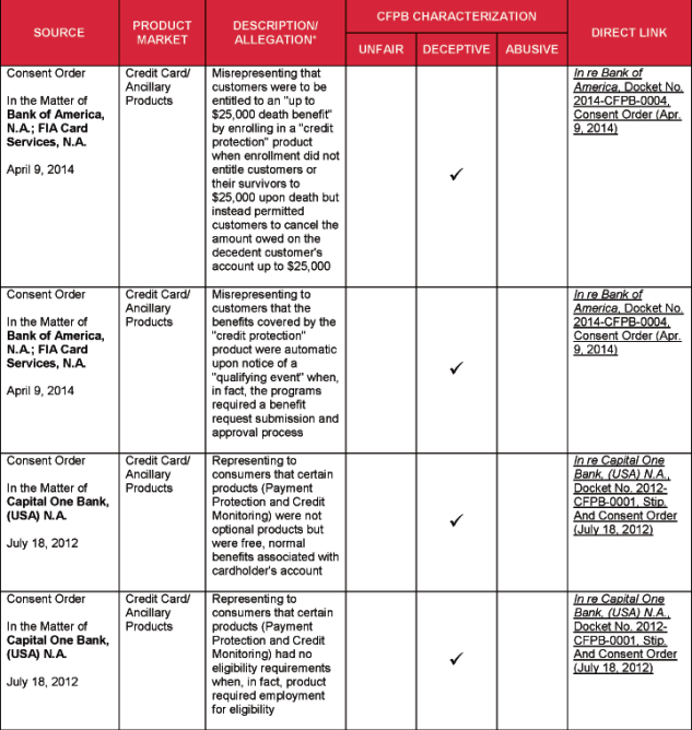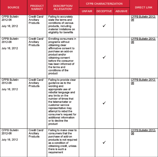 - Credit Card and Auto Loan Marketing. The CFPB has identified as “deceptive” alleged misrepresentations regarding the terms, eligibility requirements, and cost of financial products. Promises of benefits that were never provided, assertions that a product was a benefit associated with a credit product when it actually was optional, and implying a product was free all have caught the CFPB’s attention. The CFPB has alleged that certain deceptive representations resulted from third-party telemarketers going “off script,” or speeding through important disclosures in the approved scripts.