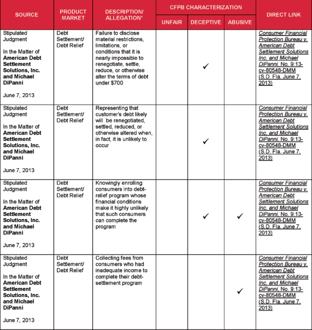 - Debt Settlement/Debt Relief. The CFPB’s first exercise of its authority to prohibit “abusive” acts and practices focused on a debt relief company the CFPB alleged was enrolling customers despite knowing that their financial condition made it highly unlikely they could complete the program, collecting enrollment fees despite this knowledge, and failing to provide any services. It would appear the CFPB concluded these practices were abusive because the provider took unreasonable advantage of vulnerable consumers who did not understand that their financial condition made it highly unlikely they would receive any benefits and who believed the company would act in their best interests by trying to settle their debt.