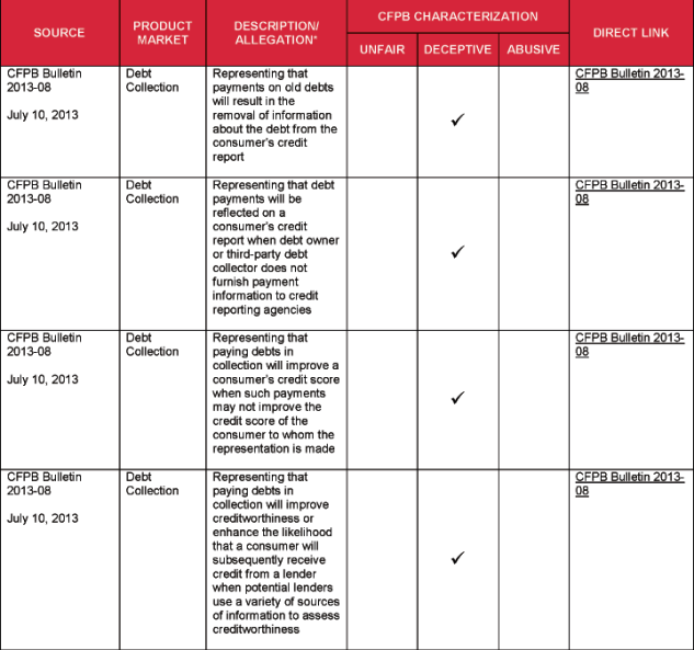 14 CFPB Bulletin 2013-07, “Prohibition of Unfair, Deceptive, or Abusive Acts or Practices in the Collection of Consumer Debts” (July 10, 2013), available at http://files.consumerfinance.gov/f/201307_cfpb_bulletin_unfair-deceptive-abusive-practices.pdf , and CFPB Bulletin 2013-08, “Representations Regarding Effect of Debt Payments on Credit Reports and Scores” (July 10, 2013), available at http://files.consumerfinance.gov/f/201307_cfpb_bulletin_collections-consumer-credit.pdf.