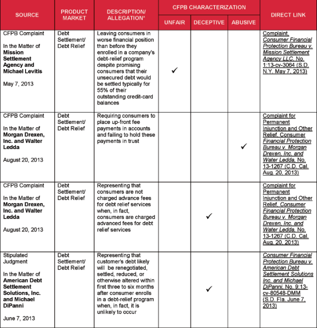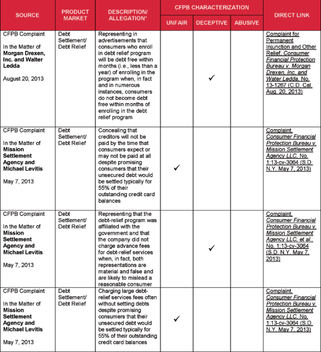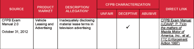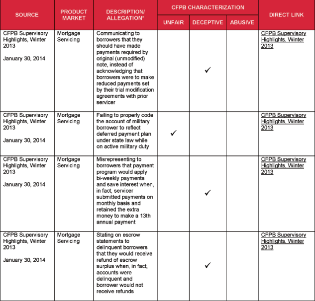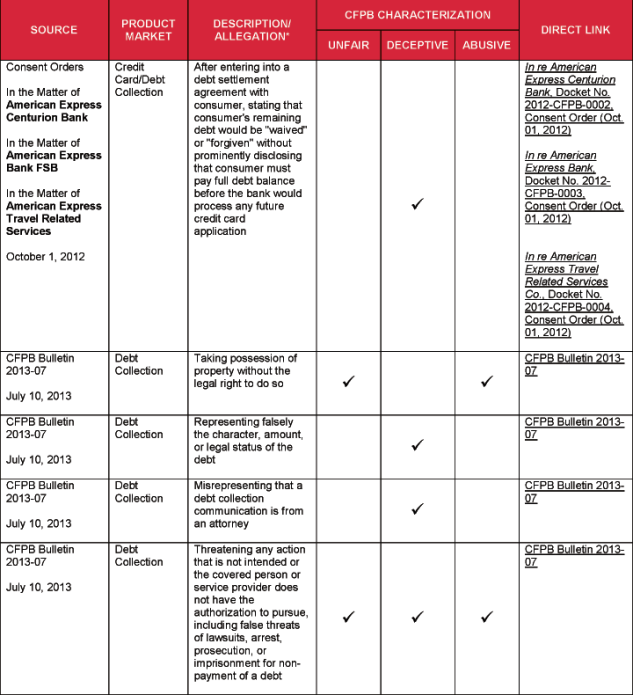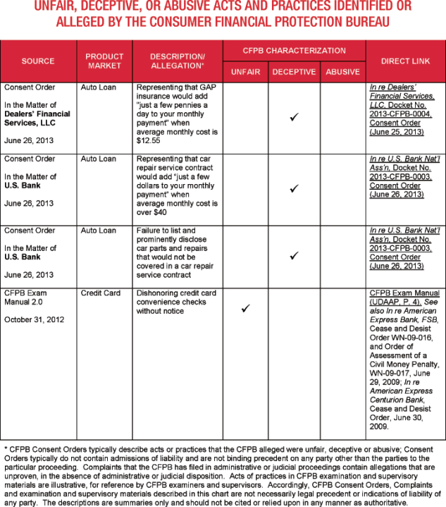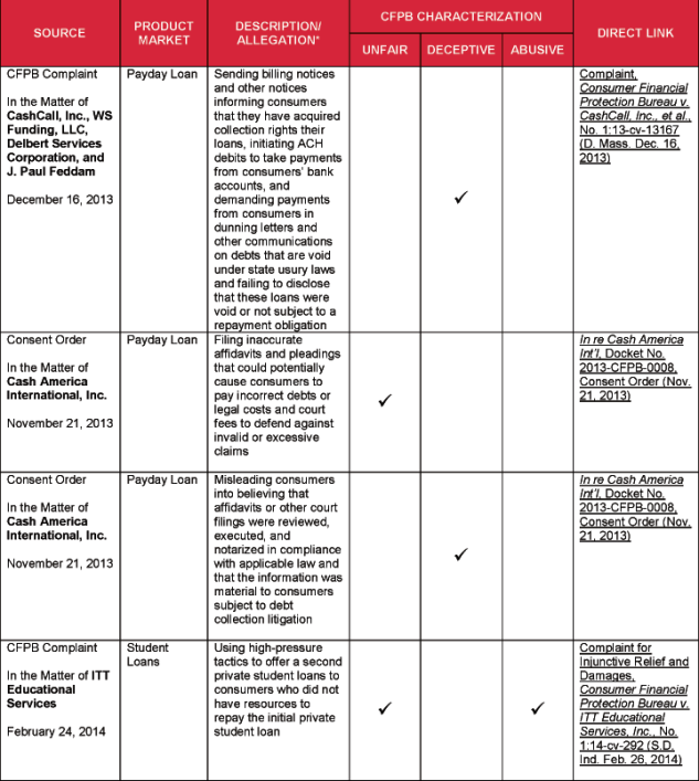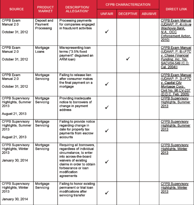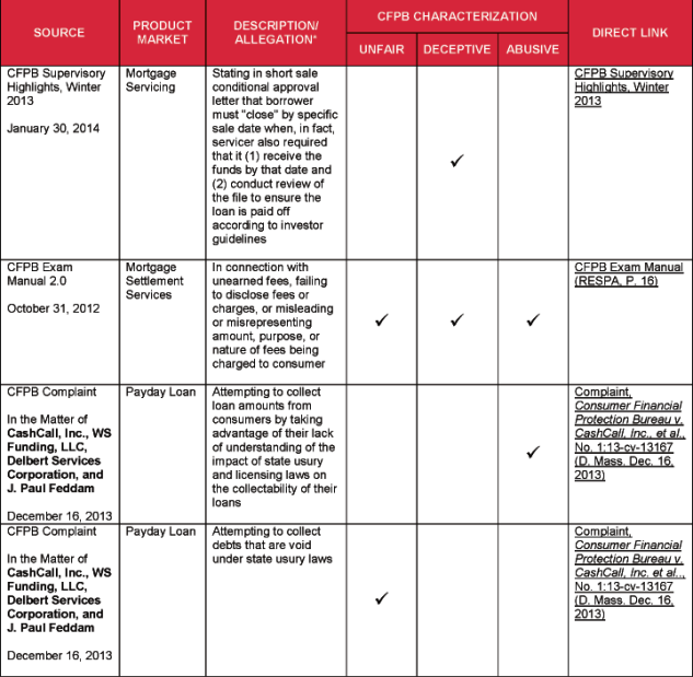 The attached chart lists specific acts and practices that the CFPB has alleged or identified as unfair, deceptive, and/or abusive. The list is drawn from several sources, including: