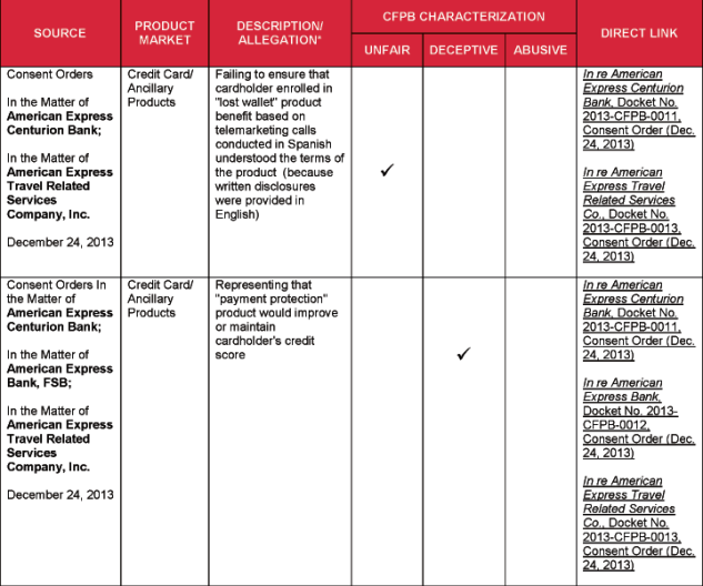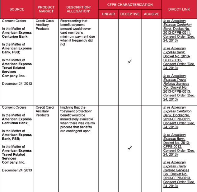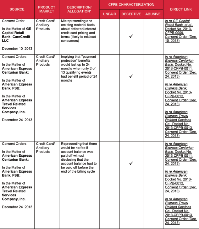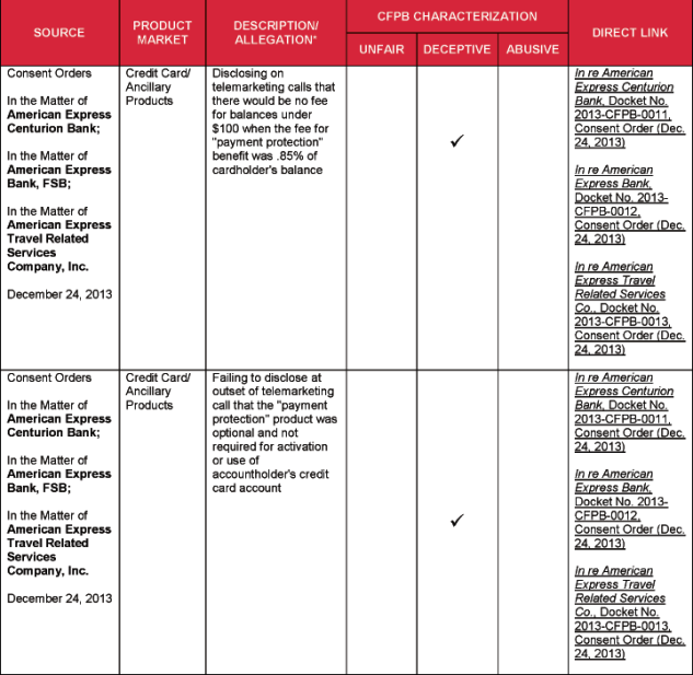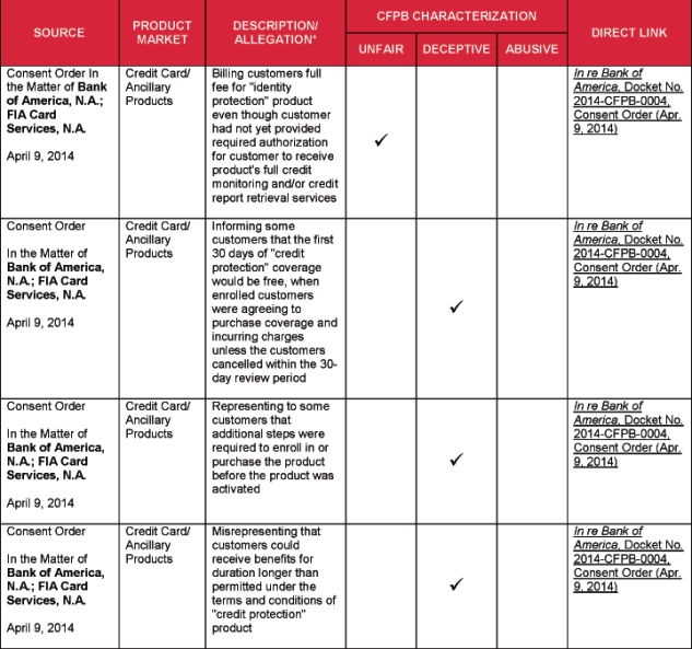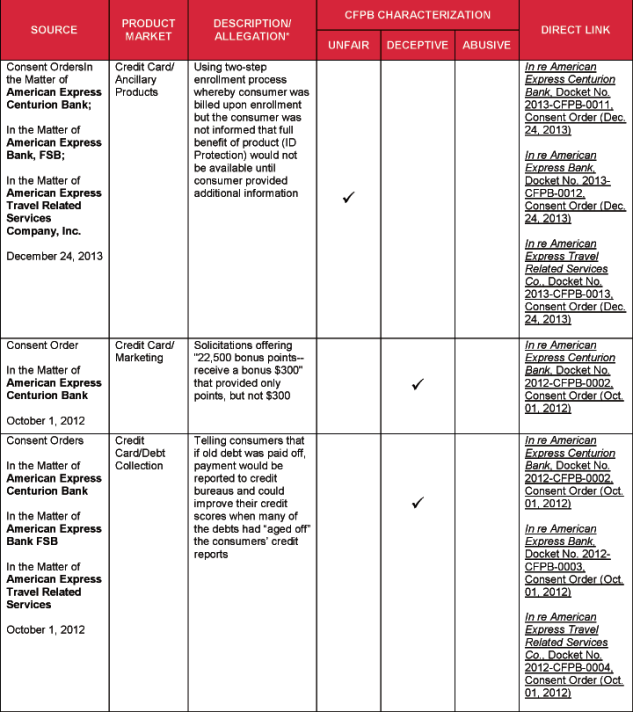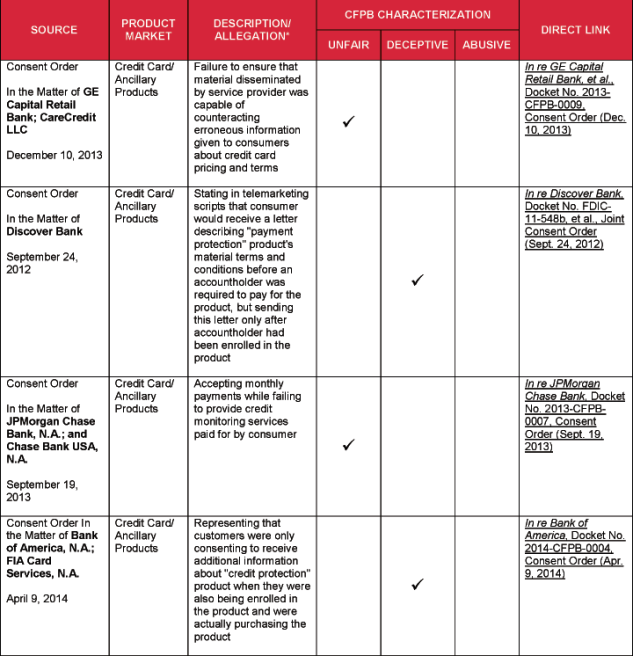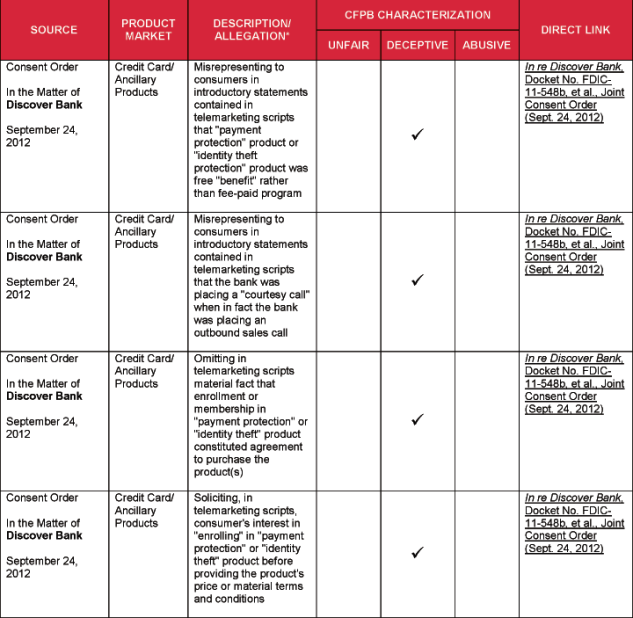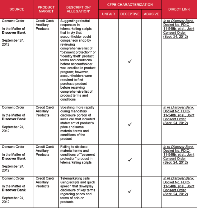 4 Specific acts and practices identified as unfair, deceptive, or abusive in substantive statutes and regulations, such as the Fair Debt Collection Practices Act and Regulation Z, and cited by the CFPB, are not included in this chart.