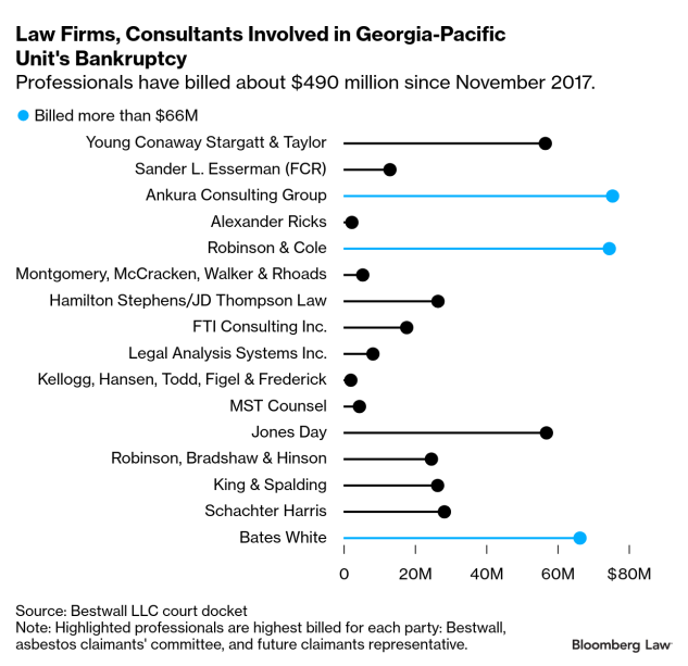 Lawyers and financial advisers working on a Georgia-Pacific unit’s bankruptcy have billed almost $490 million over nearly eight years, but bankruptcy professionals say that’s not unusually high for a case that’s trying to settle with tens of thousands of people holding asbestos claims.