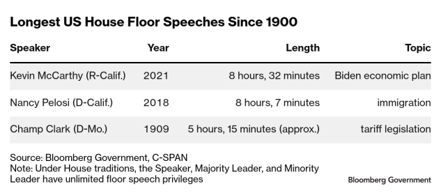 The minority leader’s remarks are now the third-longest of their kind in House history, replacing Democrat Champ Clark’s five-hour and 15-minute magic minute in 1909. Democrats hope Clark’s speech becomes a historical echo — the then-leader used his time to speak against a tariff bill that divided Republicans and led to Democrats retaking the House.
