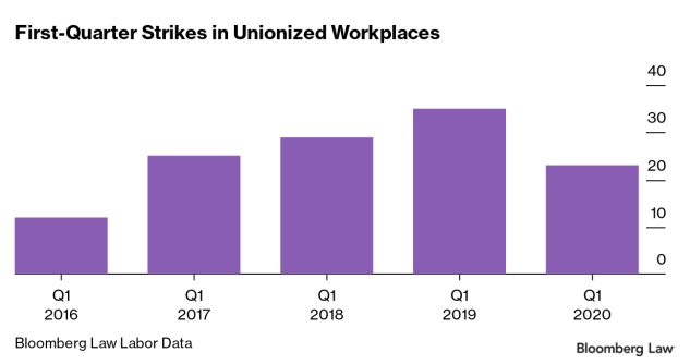 According to Bloomberg Law’s database of work stoppages, unionized U.S. workplaces saw 23 strikes in first quarter 2020, idling just 16,829 workers. These are the lowest first-quarter totals in four years.