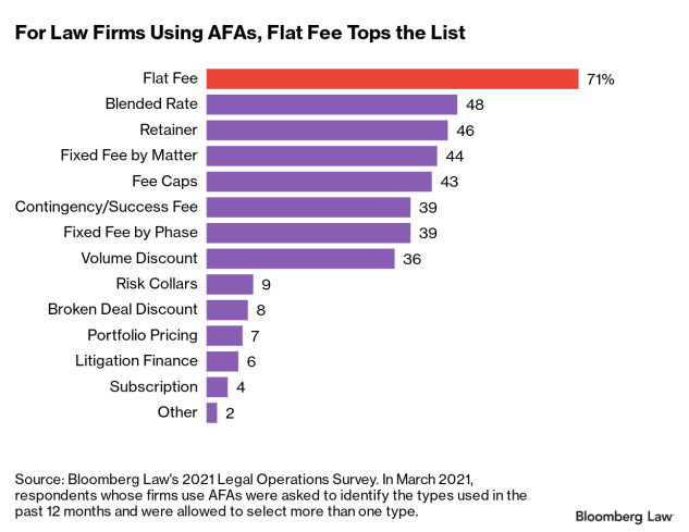 Nearly all law firms still use the traditional billable hour. Nonetheless, 84% of law firms also offer alternative fee arrangements (AFA) to charge clients for their services. Bloomberg Law’s 2021 Legal Operations Survey shows that flat fee billing was the most widely used AFA among these law firms in the past year.