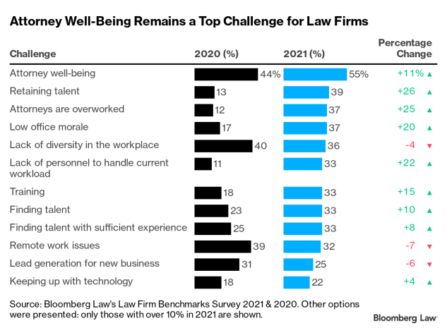 Attorneys are observing a growing number of challenges related to human resources at their law firms, according to results from Bloomberg Law’s 2021 Law Firm Benchmarks Survey. Compared to last year, the survey reveals that lawyers’ concerns have shifted away from business-building and remote work to an increased focus on factors related to employee well-being and job satisfaction.
