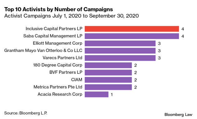 Inclusive Capital Partners LP, a new hedge fund, has joined the top ten list of activist organizations by the number of campaigns conducted, according to data from the Bloomberg Terminal. During the third quarter, the fund managed four campaigns in total.