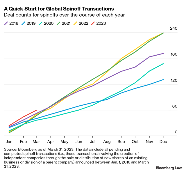 Bloomberg data show that 59 spinoff transactions have been announced so far in 2023, more than in any of the last five years at the same ...