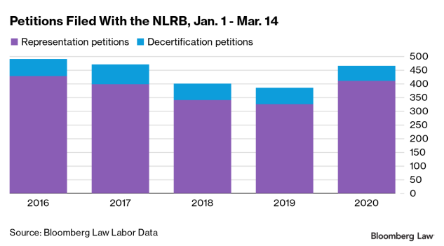NLRB data show that unions filed 411 petitions for representation elections through March 14. In the same time period of 2019, the board received only 324 representation petitions. That’s quite a turnaround in an arena where union organizing activity has steadily fallen year after year.