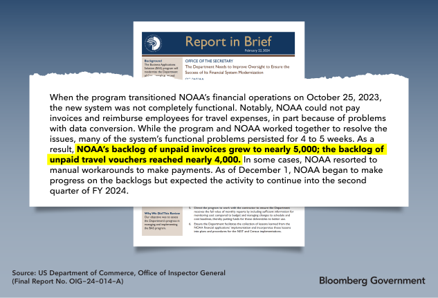 NOAA has been slow to work through the backlog. Officials told the Commerce Department’s Inspector General as of Dec. 1 they had paid about 1,000 of the delayed invoiced, totaling $84 million, and they “expected to address the remaining 4,000 invoiced by January 2024,” according to the report, which was published Feb. 22. But the problems persisted, and the backlog is expected to remain through the current quarter, according to the report.