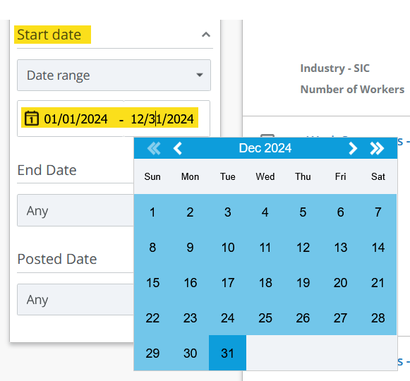 3. Find the “Start Date” filter on the left side, select the “Date Range” option in the drop-down menu, and enter “01/01/2024 – 12/31/2024" in the calendar display.