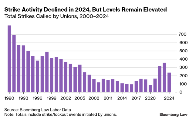 Unions led fewer strikes against US employers last year than in 2022 or 2023, according to Bloomberg Law labor data. But the 236 walkouts called in 2024 still represent the third-highest annual total in almost two decades, suggesting that the post-pandemic trend of labor unrest is still far from over.