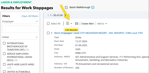 The “Strikes and Lockouts” tracker contains details of more than 11,000 work stoppages from 1989 to present, updated on a daily basis. The scope of the results can be controlled by using the filters on the left side.