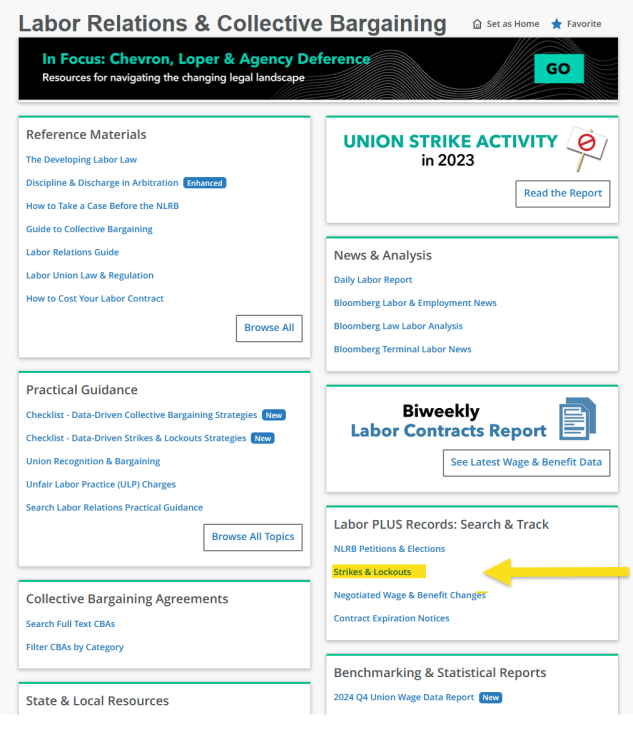 1. Visit Bloomberg Law’s Labor Relations & Collective Bargaining page. (Bloomberg Terminal subscribers: Run BLAW OUT and search for “Labor Relations & Collective Bargaining”.)