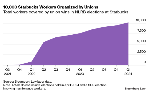 Unions have successfully organized more than 10,000 workers at Starbucks Corp. locations nationwide, according to a Bloomberg Law analysis of National Labor Relations Board election data.