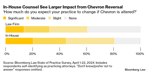 In-house counsel are more likely than law firm attorneys to foresee a shake-up to their practices if the US Supreme Court overrules or changes Chevron, according to a new Bloomberg Law survey. Across all legal professionals surveyed, regulatory-heavy practice groups are, understandably, the most wary.