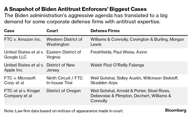 Rule’s operation isn’t alone in snapping up expanding antitrust work. Firms including Wilkinson Stekloff and Weil Gotshal & Manges are racking up hours defending Microsoft Corp.'s $69 billion acquisition last year of Activision Blizzard Inc., after the Federal Trade Commission appealed a ruling that the deal could move forward.