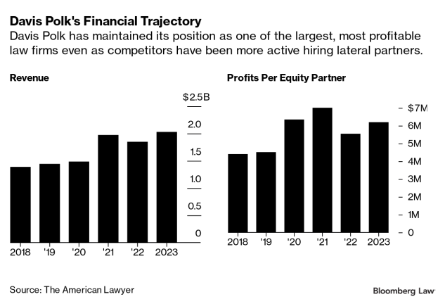The moves promise to intensify competition for talent among the largest law firms, where Davis Polk ranks 20th based on 2023 revenue of more than $2 billion, according to American Lawyer data. Its average equity partner earned $6.2 million last year, eighth most among the 100 largest firms.