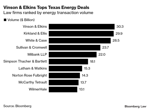 Kirkland did $29.9 billion worth of energy deals in the first three quarters in the state, just $200 million behind V&E, followed by White & Case at $28.5 billion, Sullivan & Cromwell at $23.7 billion, and Milbank at $22 billion, Bloomberg data show.