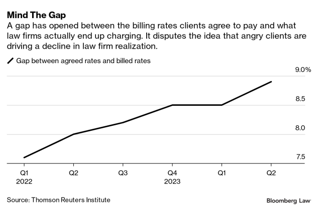 Over the past two years, a significant gap has opened between what clients agree to pay (more) and what law firm partners are actually billing (less). Among the 100 largest firms, that gap rose from 7.6% in the first quarter last year to 8.9% in the third quarter.