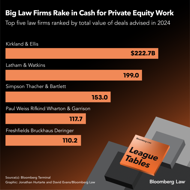 Kirkland & Ellis, Big Law’s top M&A dealmaker last year, is a major player. Others include Ropes & Gray, DLA Piper, Gibson Dunn & Crutcher, Debevoise & Plimpton, and Davis Polk & Wardwell.