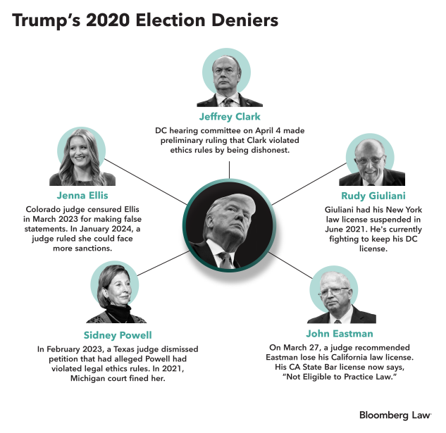 At least three attorneys—Rudolph Giuliani, John Eastman, and Kenneth Chesebro—have had law licenses suspended. They’re part of a group dragging out the process in multiple states, with allies arguing they are the victims of politically motivated witch hunts.