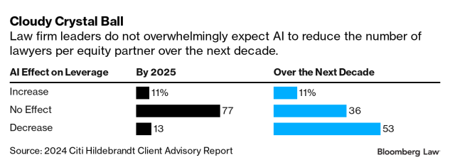 Asked to predict AI’s effect on lawyer leverage—the ratio of lawyers to equity partners—77% of law firm leaders said there would be “no effect” by 2025, according to a Citi Private Bank survey. Only 13% said leverage would decrease—i.e., fewer associates for every partner.