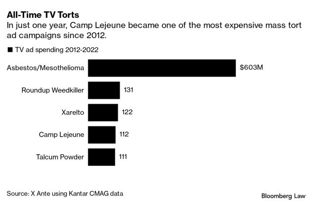 Nearly $112 million was spent on TV ads seeking Camp Lejeune victims in 2022. That equals more than double the spending on the next closest mass tort, asbestos, according to X Ante, which tracks ad spending using Kantar CMAG data.