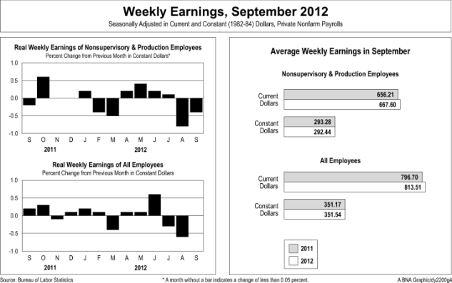 Inflation-adjusted average weekly earnings of nonsupervisory and production workers fell in September for the second straight month, the Labor Department reported Oct. 16.