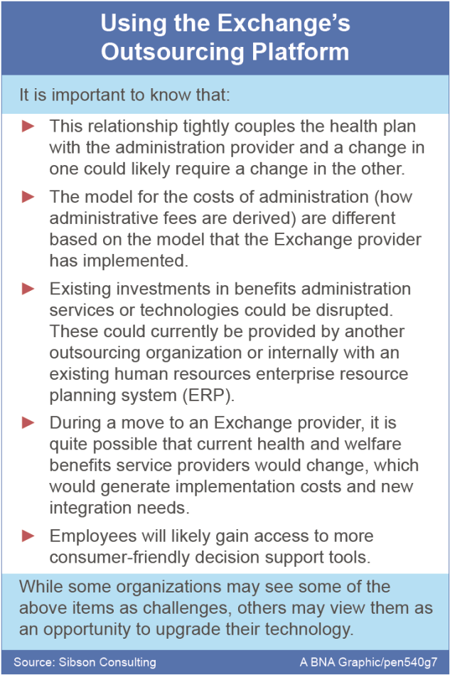 - Administrative Requirements. Some Exchanges require (or strongly prefer) that their employers use the Exchange’s outsourcing platform to seamlessly administer the benefits they offer. This raises several issues (see the sidebar “Using the Exchange’s Outsourcing Platform).