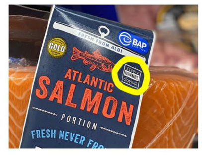 A court, however, also recently rejected ALDI’s argument that its “Simple. Sustainable. Seafood.” advertising is not misleading when read in connection with the third-party best aquaculture practices certification symbol that also appears on the front of the packaging (pictured below as in the court’s order).