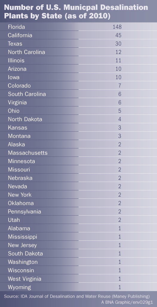 Desalination has grown faster in certain states. As of 2010, Florida had the most municipal desalination plants with 148, followed by California at 45, Texas with 30, and North Carolina having 12, according to Mickley’s paper. Mickley runs his own water and wastewater technology consulting firm and specializes in desalination and membrane technology.