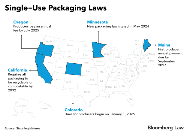 The new laws—all in different stages of implementation—are set to require companies to pay fees based on the amount of single-use packaging they sell in an effort to fund better collection, sorting and processing of bottles. Companies have to pay their first producer responsibility dues in Oregon by July 2025 and in Colorado by January 2026. The California law has a long-term goal requiring all packages for products to be recyclable or compostable by 2032. The drinks industry supported and advocated for some of these laws—in Colorado, for example—hoping to fund stronger recycling infrastructure for their products.