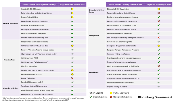 A Bloomberg Government analysis found that dozens of executive actions rolled out by the new administration this week mirror recommendations in the sweeping plan. In all, more than 30 out of Trump’s 47 initial executive actions as of Thursday afternoon match or partially align with ideas promoted in Project 2025, the analysis found.