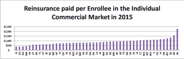 While the ACA has successfully attracted high-cost enrollees to individual marketplace coverage throughout the country, states have had very mixed results attracting healthy enrollees, and if some states have significantly worse ratios of sick to healthy enrollees, the states that have better ratios may end up paying for those who do not. The Temporary Reinsurance Program has had a far lower attachment point, but it is similar to the high-risk pool proposal in terms of pooling and payment methodology. Thus, looking at the reinsurance payments per individual market member for each state under the Temporary Reinsurance Program provides an indication as to the magnitude of the reinsurance transfers these states might expect under the proposed high-cost risk pool. Nationally, the average 2015 Temporary Reinsurance Program payment was $780 per individual market member. However, on a state-by-state basis, the average payment per enrollee varies significantly, as depicted in the following graph:26The reinsurance per enrollee is derived by taking the total reinsurance payments in the state (which is available in the Summary Report on Transitional Reinsurance Payments and Permanent Risk Adjustment Transfers for the 2015 Benefit Year, June 30, 2016 at https://www.cms.gov/CCIIO/Programs-and-Initiatives/Premium-Stabilization-Programs/Downloads/June-30-2016-RA-and-RI-Summary-Report-5CR-063016.pdf) and dividing by the total marketplace enrollees. On-Marketplace enrollment data can be found in the December 31, 2015 Effectuated Enrollment Snapshot (https://www.cms.gov/Newsroom/MediaReleaseDatabase/Fact-sheets/2016-Fact-sheets-items/2016-03-11.html). There is no good source of off-marketplace effectuated enrollment data, but the best estimate based on industry experts looking at state filings is that it is roughly 15 percent of on-Marketplace enrollment. Due to perceived inaccuracies, the CMS data for Minnesota was replaced with data from Healthinsurance.org (https://www.healthinsurance.org/minnesota-state-health-insurance-exchange/).