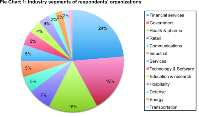Pie Chart 1 shows the industry distribution for respondents who are employed by private and public sector organizations. As can be seen, the largest sectors include financial services (including banking, insurance, credit cards, investment management), public sector (including federal, state and local government organizations), and health care and pharmaceuticals.