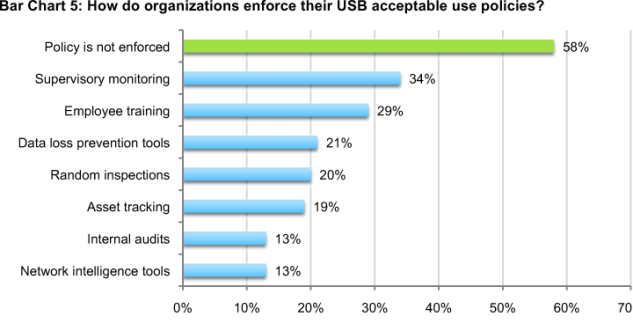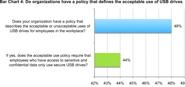Organizations could improve the state of USB security by having policies that define the acceptable use of USB drives and enforcing those policies. As shown in Bar Chart 4, fewer than half (48 percent) of respondents say their organizations have USB security policies that define acceptable use.
