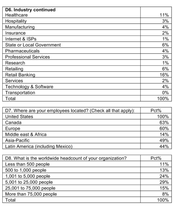 Table 3 shows the headcount (size) of respondents’ business companies or government entities. As can be seen, 52 percent of respondents are employed by larger-sized organizations with more than 5,000 individuals.