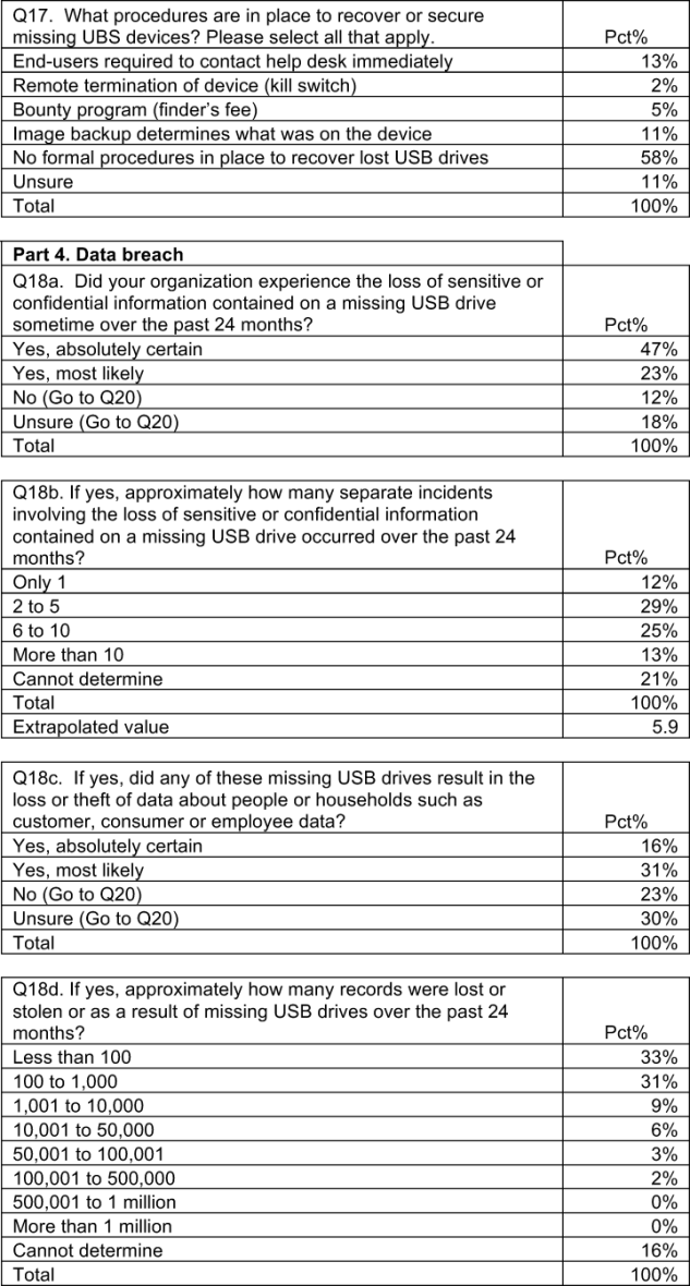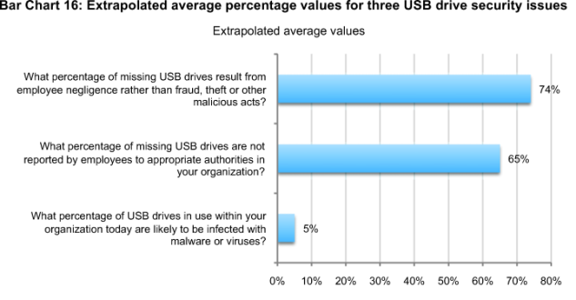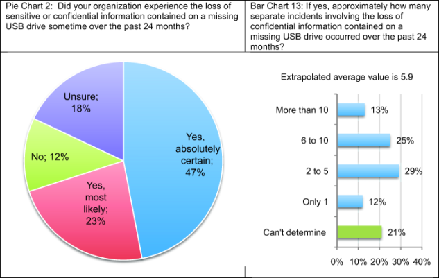 Our goal in presenting this research is to show that USBs may look insignificant but the consequences of a data breach from a lost or stolen device can be huge. More than 70 percent of respondents in this study say they are absolutely certain or believe it was most likely that their organizations experienced a data breach as the result of sensitive or confidential information contained on a missing USB drive. On average, organizations in our study have lost more than 12,000 records about customers, consumers and employees contained on USB drives. Based on Ponemon Institute’s 2010 Annual Cost of a Data Breach, the financial consequences of losing 12,000 records can cost an organization as much as $2.6 million.