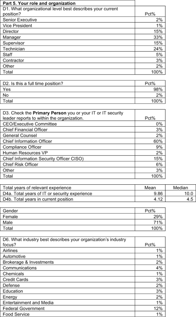 Table 1 summarizes the sample response for this study conducted over a five-day period ending in June 2011. Our sampling frame of practitioners consisted of 20,779 individuals located in the United States who have bona fide credentials in the IT or IT security fields. From this sampling frame, we invited 19,511 individuals. This resulted in 856 individuals completing the survey of which 113 were rejected for reliability issues. Our final sample was 743, resulting in a 3.6 percent response rate.