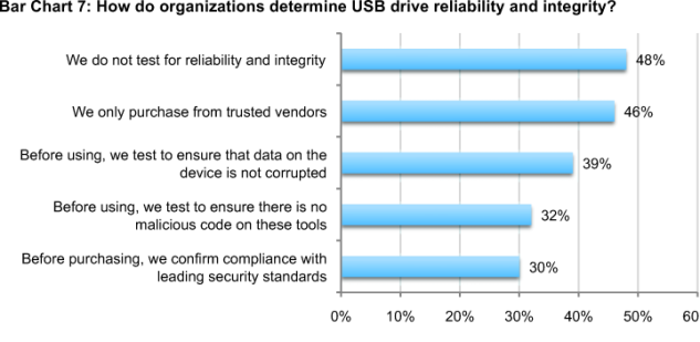 Bar Chart 7 shows how organizations attempt to vet USB reliability. According to 48 percent of respondents, organizations do not test for reliability and integrity in advance of use by employees. About one-third of respondents (32 percent) say their organizations test devices for malicious code. Thirty percent say they confirm USB drive compliance with leading security standards (such as the National Institute of Standards and Technology (NIST) Federal Information Processing Standard ( FIPS Pub. 140-2 ) before purchasing them.