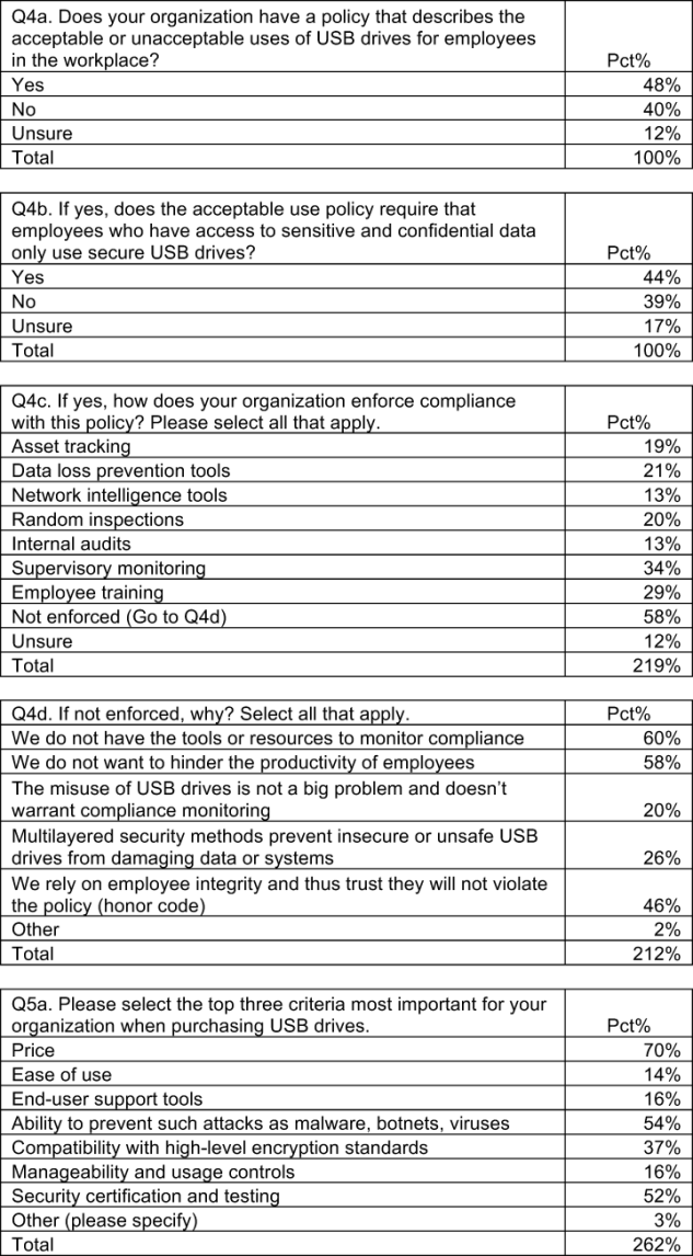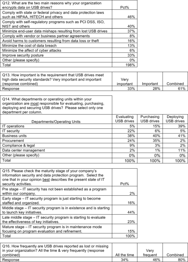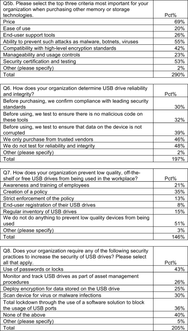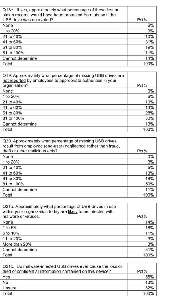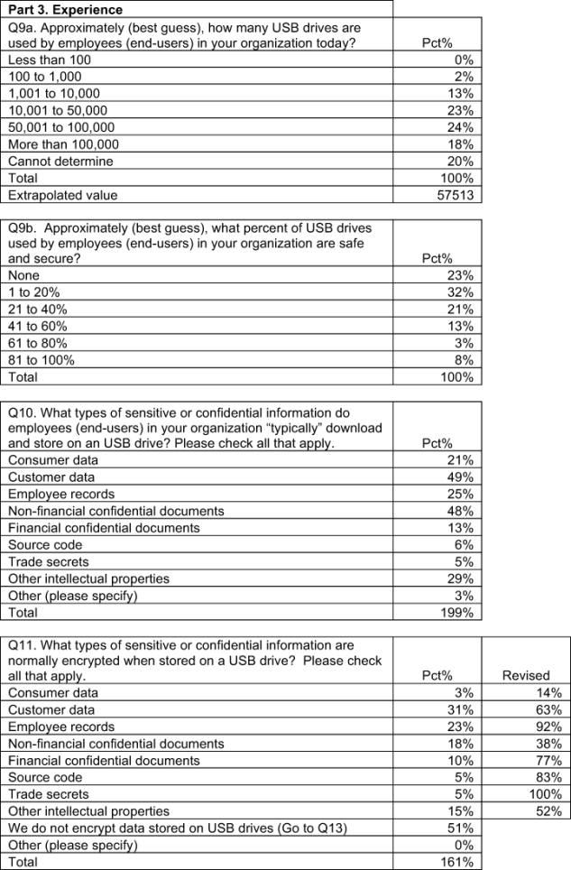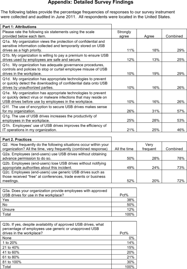 The next section reports the key findings of our independently conducted survey research. Taken together, our results provide strong evidence that organizations are not addressing the potential data protection and security risks caused by the rash of ubiquitous and unsafe USB drives that pervade many organizations.