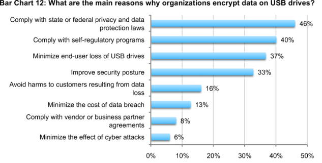 More than half (51 percent) of respondents report that they do not encrypt data stored on USB drives (not shown in the chart). If they do encrypt, it is to be in compliance with state or federal privacy and data protection laws and self-regulatory programs such as the Payment Card Industry Data Security Standard (PCI DSS), International Standards Organization (ISO), NIST and others. Bar Chart 12 summarizes other reasons organizations encrypt USB drives.