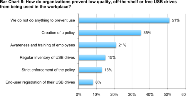 According to Bar Chart 8, to keep low quality USBs out of the hands of their employees, more than half (51 percent) of respondents say their organization does not do anything. Thirty-five percent say they have a policy and 21 percent they have awareness and training initiatives for their employees.