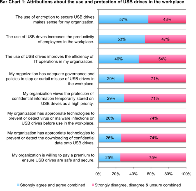 We believe the lesson to be learned from the research is that organizations do understand they are at risk because of employees’ negligence but are not taking the necessary steps to secure USB drives. The main reasons cited for not being proactive include: uncertainty about monitoring and tracking USB use in the workplace, desire not to diminish productivity and the reliance on employee integrity and trustworthiness.