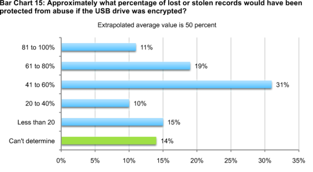 Respondents believe, on average, about half of all data lost or stolen from USB devices would be protected if the USB drive had been properly encrypted.