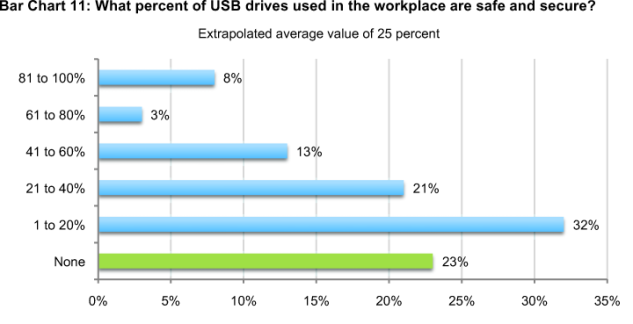 As shown in Bar Chart 11, on average 25 percent of USB drives used by employees are considered safe and secure according to respondents. The most at-risk information assets often temporarily stored on USB devices include customer data, non-financial confidential documents and other intellectual properties (including design documents and source code).