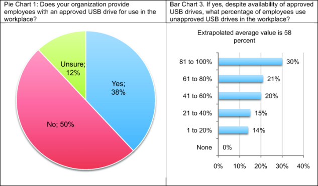 Despite awareness of employees’ abuse of USB drives, the vast majority of respondents (75 percent) say their organizations are not willing to pay a premium to ensure USB drives used by employees are safe and secure (not shown in the chart). In fact, as presented in Pie Chart 1, half of respondents say their organizations do not provide employees with approved USB drives and 12 percent are unsure. While 38 percent of respondents’ organizations supposedly provide approved USB drives to employees, an extrapolated average of 58 percent of employees in these organizations continue to use unapproved USB drives (see Bar Chart 3).