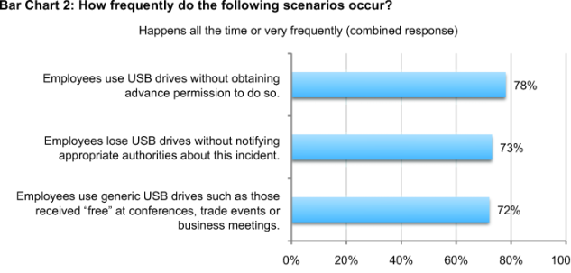 Employees are negligent when using USB drives and this is putting organizations’ sensitive data at risk. Employees are doing the following: using USB drives without obtaining advance permission to do so all the time (50 percent) and frequently (28 percent); losing USB drives without notifying appropriate authorities about this incident all the time (49 percent) or very frequent (24 percent); and using generic USB drives such as those received free at conferences, trade events and business meetings all the time (52 percent) and frequently (20 percent).